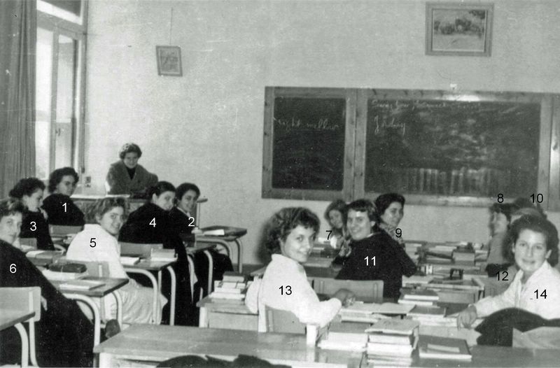 Cours d'Anglais (Avril 1958) 1. A.BOISSENOT; 2. H.FENINE; 3. A-M.MASSE; 4. J.CHAVY;5.L.CATTINO 6. S.IVORRA; 7. M.BEZOMBES; 8. M.PILON; 9. J.LABADIE; 10. A.BESSONNE; 11. A.RIPOLL; 12. D.RIPOLL; 13. G.NARDY; 14. Y.BOUZOU |