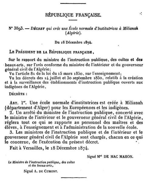 Le 18 décembre 1874, le Président de la République Française, le Maréchal de MAC-MAHON, signe un décret portant sur la création d'une Ecole Normale d'Institutrices en Algérie. Cette école sera implantée sur la commune de Miliana deux ans plus tard (rentrée 1876).